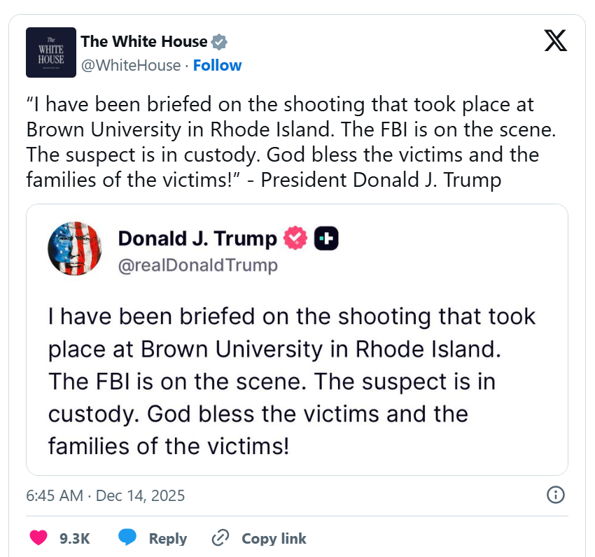 布朗大學發佈消息。 警方表示,疑犯是一名男子,穿黑色衫,相信他是徒步離開現場,目前不知道他如何進入大學大樓。目擊者看到嫌犯從布朗大學大樓裡走出,沿霍普街一側跑步逃離。 事發當日,大學正值學期末考試第二日,校方傍晚發出緊急警報,要求師生找地方躲避。有學生表示,事發時與同學正在實驗室,接獲警報後,立即關燈及關門,躲在桌下。校方要求校區內的人繼續原地躲避,並將手機調校至靜音,注意安全。 總統唐納德·特朗普就槍擊事件作出回應,稱他已聽取了有關槍擊事件的簡報。他也告知公眾,聯邦調查局已抵達現場。他在社交媒體上寫道:“聯邦調查局已抵達現場。嫌疑人已被拘留。”不過,不久特朗普又在社交媒體改口稱嫌疑人未被抓獲,仍在逃。