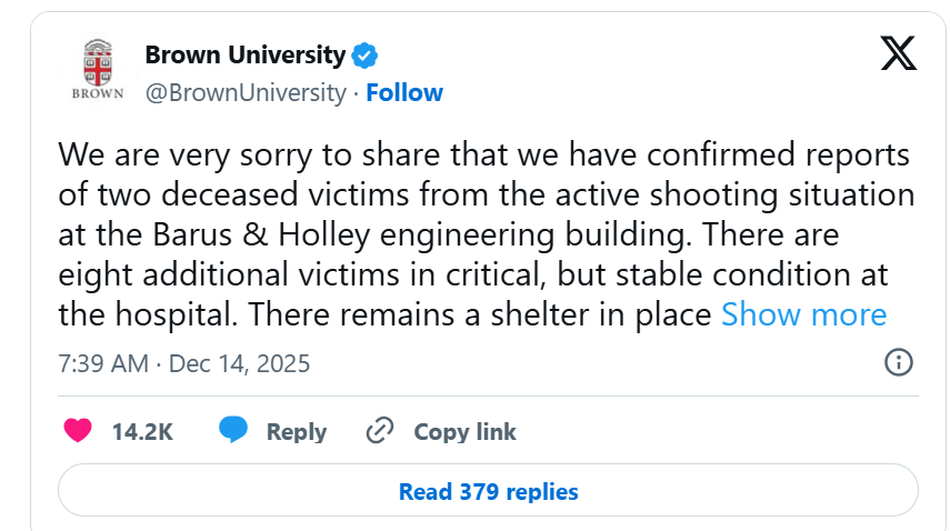 香港新聞網12月14日電 美國當地時間周六(13日)下午4時左右,位於美國羅得島州普羅維登斯市的布朗大學驚傳槍案,一名黑衣槍手闖入學校,在工程學院槍擊至少11人,造成2人死亡,9人送醫救治。總統特朗普就槍擊事件作出回應。 據校方消息,槍擊事件發生在巴魯斯-霍利大樓,是工程學院和物理系所在地。當天下午該樓安排了多場考試。