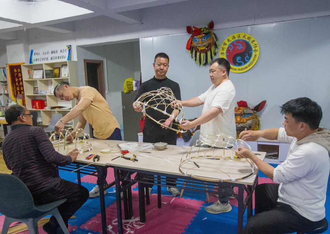 眾學員製作好的虎頭白撲。 連日來,武館的扎作工坊燈火通明。香港師傅手把手糾正學員的扎架角度與裱糊張力,學員們手指被竹篾劃破也顧不上包扎。至4月6日深夜,十餘名學員合力完成了三件虎頭道具,學員說:“連續四天從早上9點扎到凌晨一兩點,手腫了,但看到自己親手做的虎頭,什麼都值了。”