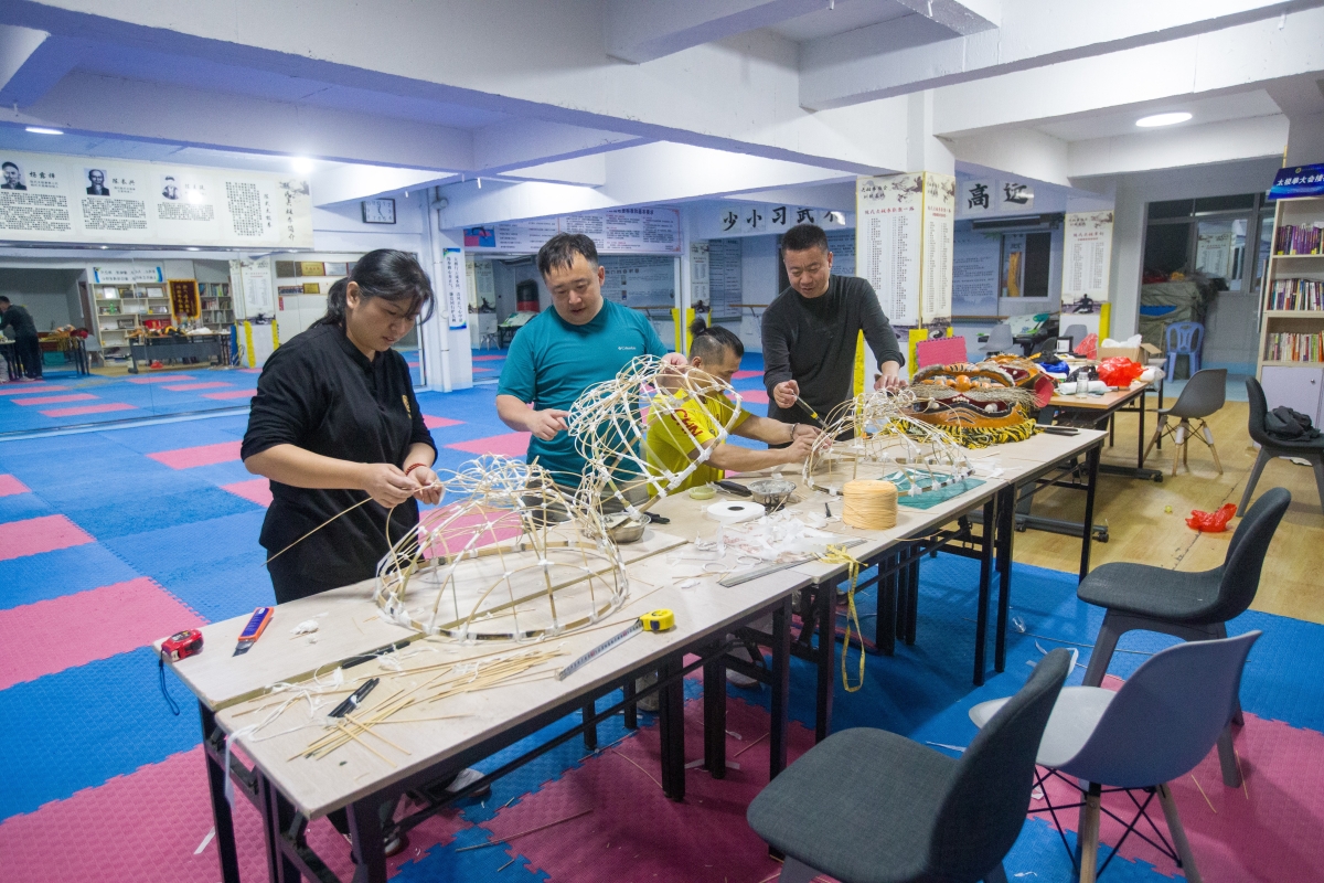 尊傳武館鄭真勇師傅(中)帶領弟子:沈建雄、林麗玉、陳加福、沈建明與惠民堂國術會劉震宇師傅(右二)研習扎作技巧。 兩地交流活動旨在讓傳承人與學員心無旁騖地沉浸於技藝交流。每日上午9時起,尊傳武館訓練廳內便響起鑼鼓與弄虎步法的節拍聲。惠民堂國術會的師傅亦演示客家舞麒麟的步法及動作,相互交流步伐、身法、眼神與鑼鼓的配合關係;對比動作儀式中的差異。雙方傳人反復切磋同一動作的不同發力方式。腰背爆發力,雖皆源於仿生象形,但節奏與呼吸法各有奧妙。亦為研究扎作虎頭時提供重要數據。 最令參與者難忘的,是連續數日的“馬拉鬆”式扎作。惠民堂國術會帶來了香港扎作麒麟頭的全套工具與材料,從選竹、劈篾、扎架、糊紙、上色到點睛,逐日分解教學。漳州主辦方專門派出十多名年輕學員,全天候跟學。為在活動結束前完成一批成品,大家自發將工作時間延長至凌晨。