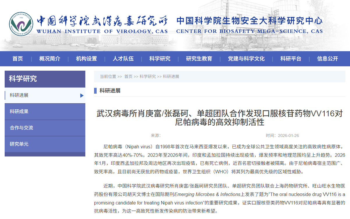 圖源:中科院武漢病毒研究所網站截圖 尼帕病毒(Nipah virus)自1998年首次在馬來西亞暴發以來,已成為全球公共衛生領域高度關注的高致病性病原體,其致死率高達40%至70%。2023年至2026年間,印度和孟加拉國持續出現疫情,暴發頻率和地理範圍均呈上升趨勢。2026年1月,印度西孟加拉邦及周邊地區再次出現疫情,已有死亡病例,近百名密切接觸者被隔離。由於尼帕病毒宿主範圍廣、致死率高,且目前尚無獲批的藥物或疫苗,世界衛生組織(WHO)將其列為最高優先級的區域性威脅。 近期,中國科學院武漢病毒研究所蕭庚富/張磊砢研究員團隊、單超研究員團隊,聯合上海藥物研究所、旺山旺水生物醫藥股份有限公司胡天文博士,在國際期刊Emerging Microbes&Infections上發表了有關VV116 的重要研究成果,證實口服核苷類藥物VV116對尼帕病毒具有顯著的抗病毒活性,為這一高致死性新發傳染病的防治帶來新希望。