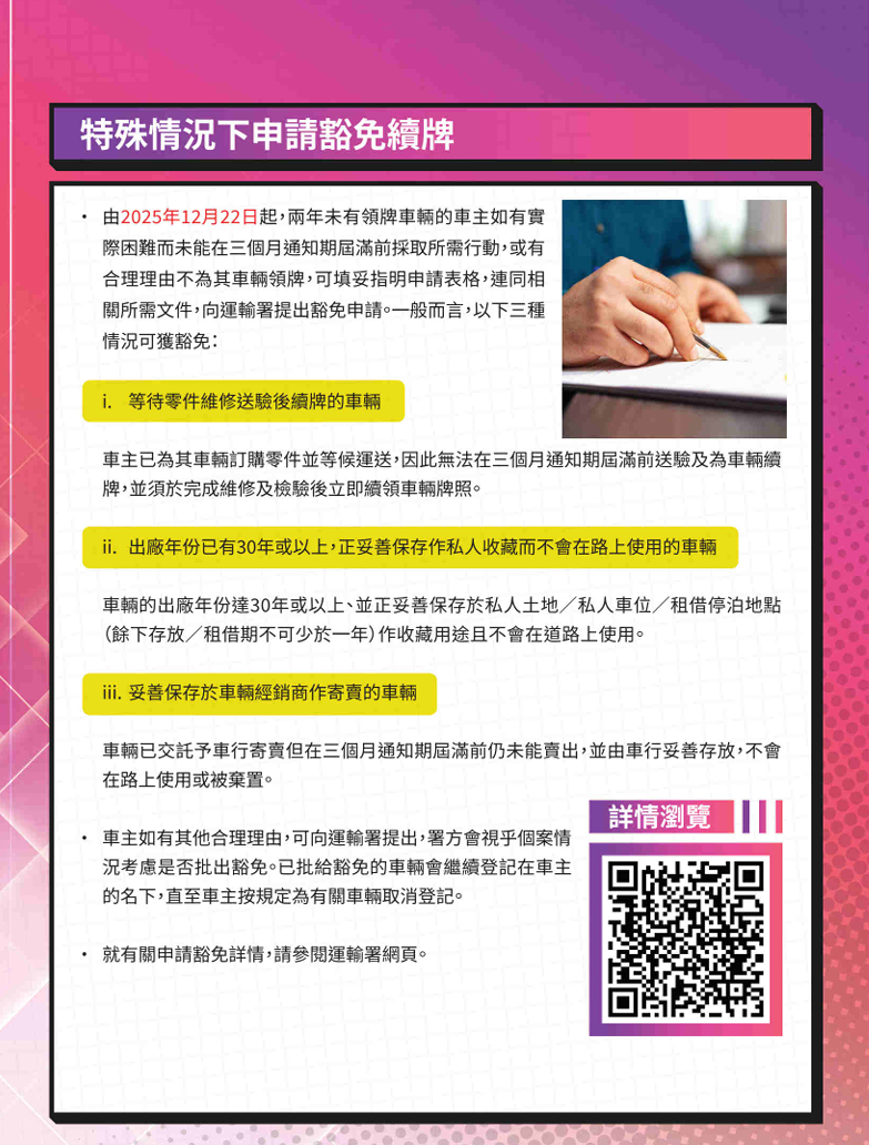 香港新聞網12月14日電 香港運輸署今日宣布,車輛登記及領牌新制度將於12月22日實施,旨在加強規管長期未領牌的車輛,從源頭解決不當棄置車輛的問題。在新制度下,未領牌車輛將一直登記在車主名下,車主須為其車輛負上責任。 運輸署發言人說:“由十二月二十二日起,署方將向兩年或以上未領牌車輛的登記車主發出通知書,要求車主必須在發出通知書日期的三個月內為車輛領牌,或把車輛拆毀或永久送離香港後,將相關證明文件提交運輸署,並取消登記。車主須及時妥善處理車輛,以免觸犯法例。” 如車主在該三個月通知期屆滿前仍不作適當跟進,即屬犯罪。首次定罪最高可罰款10,000元和監禁三個月;其後每次定罪最高可罰款25,000元和監禁六個月。除非已繳付罰款,否則運輸署可根據法庭命令:(一)拒絕向被定罪車主發出或續發駕駛執照;(二)不處理涉事車輛及被定罪車主名下其他車輛的過戶通知;及(三)拒絕向涉事車輛及被定罪車主名下其他車輛發出車輛牌照。 個別車主如有實際困難而未能在三個月通知期屆滿前採取所需行動,或有合理理由不為其車輛領牌,可向運輸署申請豁免。一般而言,可獲豁免的車輛包括:(一)等待零件維修送驗後續牌的車輛;(二)車齡30年或以上、正妥善保存作私人收藏而不會在路上使用的車輛;或(三)妥善保存於車輛經銷商作寄賣的車輛。申請豁免的資格、指引、申請表及所需文件詳見。署方會視乎個案情況考慮是否批准申請。 發言人提醒車主,即使未為車輛領牌或成功申請豁免,車輛仍會一直登記在其名下,車主須繼續承擔車輛引起的所有法律責任。車主可善用運輸署的網上平台,查閱名下車輛牌照屆滿日期、處理各類牌照事務及妥善處理名下未領牌車輛。