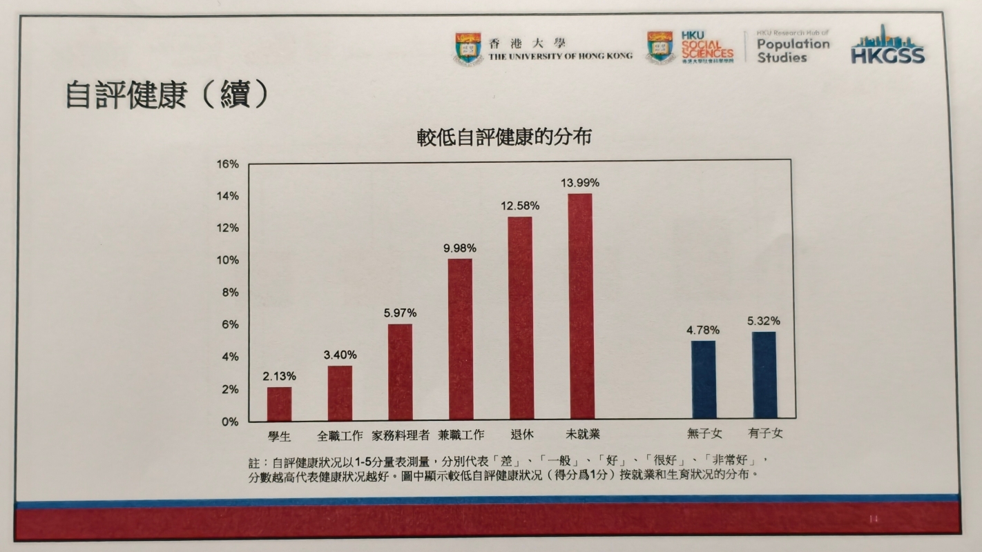 香港新聞網1月28日電 (記者梁嘉軒)香港大學人口研究中心28日公佈就香港綜合社會調查的研究結果。數據顯示,在各就業狀態中,未就業者有較差的自評健康狀况、較低的幸福感和較高的抑鬱程度。