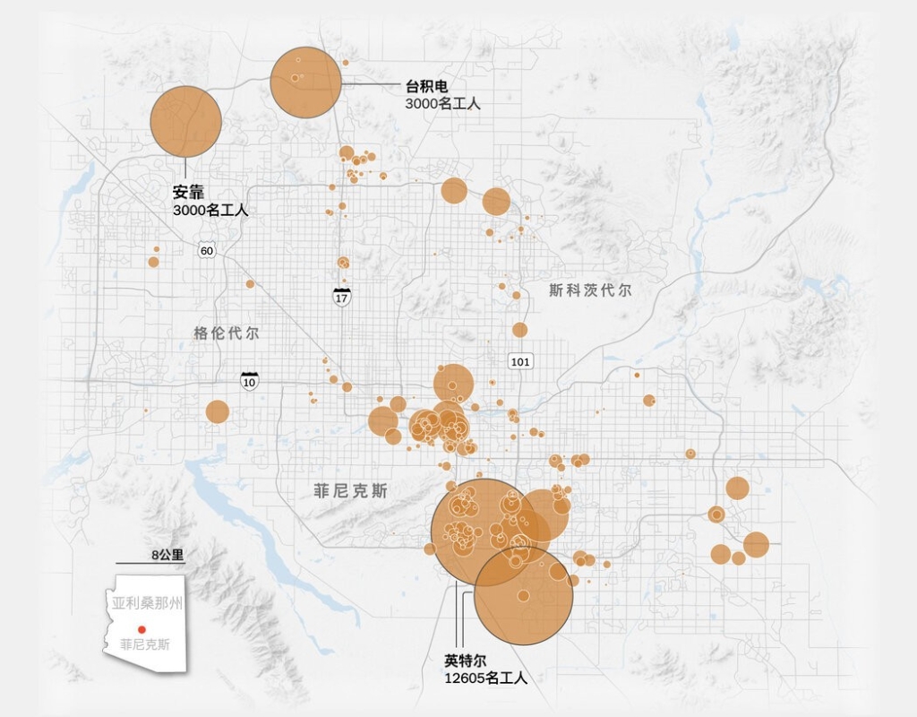 (圖)鳳凰城(Phoenix又譯作菲尼克斯)位於美國亞利桑那州西南的索諾拉沙漠,屬於亞熱帶沙漠氣候,陽光日照充足,但水資源短缺。互聯網資料圖 但在鳳凰城,任何建設項目都繞不開水的問題。水資源短缺促使州和地方政府不得不限制開發。 芯片工廠需要大量的水。台積電的前三座工廠預計每天總共需要1640萬加侖的水,這大致相當於20萬戶家庭的用水量。 台積電錶示,預計這些用水幾乎不會來自市政供水系統。該公司正在建設一座廢水處理廠,稱未來水幾乎可實現全部循環利用。 截至2024年春,台積電已承諾在鳳凰城建造三座工廠,投資額達650億美元。隨後,特朗普普重返白宮,又促使該公司承諾將其計劃規模擴大1倍以上。 製造電腦芯片是一種工業魔術。數十億個微觀晶體管被塞到薄薄的矽片上,其工序有點像製作照相底片。機器發射的光束細到令人難以想像,一根人類的頭髮可能比它粗5000倍。 但安裝這些設備並使其正常運行,需要具備專業訓練和經驗的人員。兩年前,台積電承認難以找到掌握相關技術的本地人才。為此,公司從台灣引進了500多名經驗豐富的工人。 但美國當地工會指責台積電違反了美國聯邦補貼的精神和規定,並敦促移民當局拒絕為這些台灣工人發放簽證。 台積電通過承諾優先考慮美國工人解決了這一衝突。但勞資糾紛仍在持續。 一樁由28名亞利桑那州和加利福尼亞州台積電前任及現任員工提起的訴訟,指控該公司依賴台灣籍高層管理人員,這些管理人員以中文處理業務、排擠美國員工,同時貶低本地僱員。 訴狀描繪了晶圓廠內部的危險狀況,並稱台積電習慣性地從台灣調人,而不是投資訓練本地員工。 台積電拒絕就該訴訟置評。該公司在一份聲明中表示,它“致力於為員工提供一個安全、友好且包容的工作環境”。 亞利桑那州的相關部門要求台積電對廠址進行勘察,以確保場地內沒有沙漠龜棲息。菲尼克斯城方面則要求台積電確認並移植受保護的沙漠植物物種。 34歲的消防保護工程師戴維·阿米里於2022年6月入職台積電時,以為公司會重視他對相關安全規範的了解;此前,他曾擔任鳳凰城消防檢查員三年多時間。 他告訴主管,公司必須擴建自動噴水滅火系統。他表示,這是一個嚴重的安全問題。但阿米里說,公司的台灣籍經理并沒有理會他的擔憂。 “他們想在美國完全照搬他們在台灣的做法,”他說。“他們的設計一點都沒改。” 阿米里稱,台積電的保險公司的檢查員後來注意到了這一缺陷並要求整改,其成本高達“六位數”。2024年6月,阿米里沮喪地辭職了。