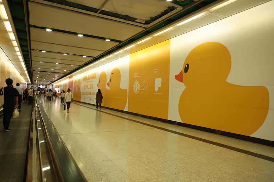 香港中通社圖片 展覽主辦機構AllRightsReserved和港鐵公司合作,橡皮鴨隨著港鐵公司廣闊的網絡“游走”至不同社區,合共覆蓋24個港鐵車站。 金鐘站已經化身成橡皮鴨主題車站,月台、樓梯、扶手電梯、牆壁等位置都滿佈小鴨蹤影,大如整隻橡皮鴨,小如水滴、腳印等設計。 AllRightsReserved副美術指導劉倩介紹,這次合作最特別是位於橡皮鴨主題E出口的半圓玻璃天窗的設計,採用半透光貼紙,希望為大家帶來多角度觀賞橡皮鴨。適逢橡皮鴨訪港十周年,活動還特別將不同的香港特色融入設計當中。 港鐵公司企業事務及品牌總監蔡少綿表示,巨型橡皮鴨盛載市民多年的歡樂回憶,今年橡皮鴨結伴重臨,港鐵公司很高興能夠將橡皮鴨以不同的可愛造型帶進車站,今個夏日為乘客呈獻一趟橡皮鴨的歡樂鐵路旅程。 巨型橡皮鴨是由荷蘭藝術家霍夫曼(Florentijn Hofman)創作,創作初心是希望以無限放大的童心吸引繁忙都市人的目光,鼓勵乘客停下來感受和細味生活片刻。(完) 【編輯:纪东】