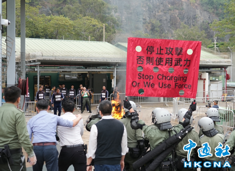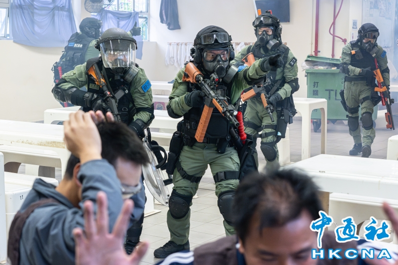 •   12月6日,香港懲教署在大欖懲教所進行代號為“和諧22號”的應變演習,模擬懲教院所內發生在囚人士集體違紀、挾持人質及外界人士企圖包圍囚車、設置生化武器等事件。圖為懲教人員處理挾持人質事件。 香港中通社圖片