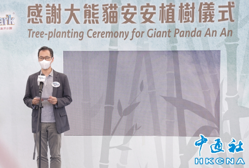 •   9月28日,香港海洋公園為今年7月21日逝世的大熊貓安安舉行植樹儀式,紀念這位“大熊貓大使”。安安享年35歲,是人類照顧下全球最長壽的雄性大熊貓。圖為香港海洋公園公司主席龐建貽致辭。(香港中通社記者 曹文毓攝) 香港中通社圖片