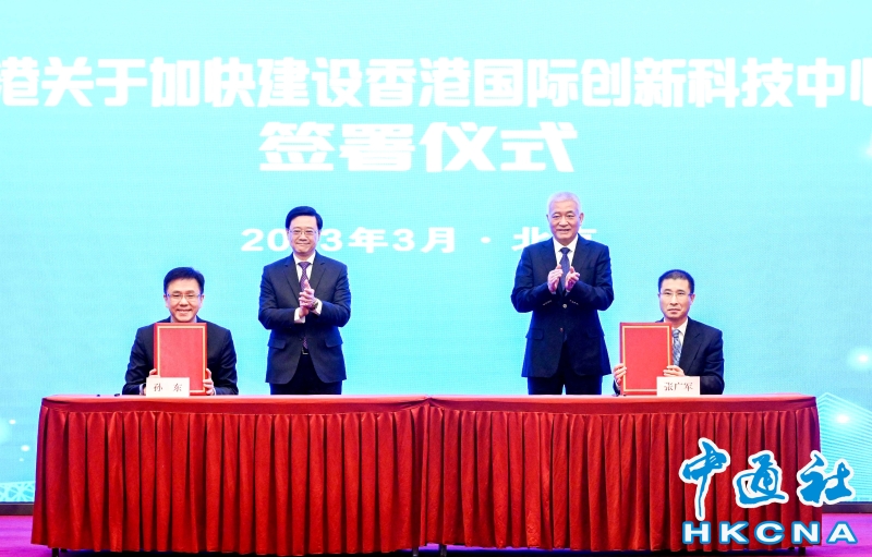 •   香港特區創新科技及工業局局長孫東教授(前排左)15日與國家科學技術部副部長張廣軍教授(前排右)在北京簽署《內地與香港關於加快建設香港國際創新科技中心的安排》。圖為行政長官李家超(後排左)和國家科學技術部部長王志剛(後排右)見證簽署儀式。 香港中通社圖片