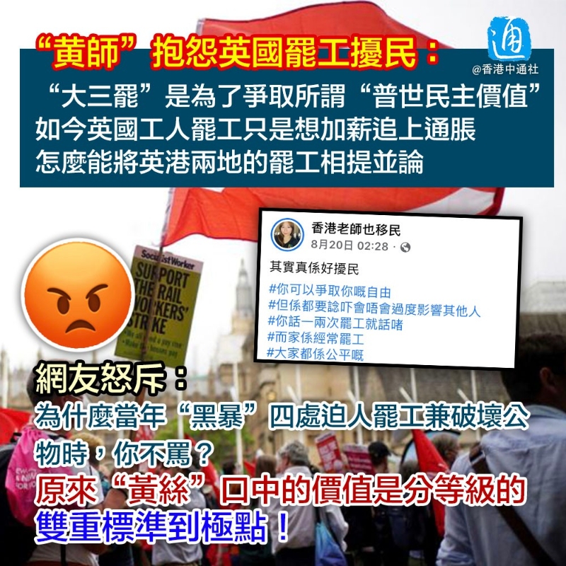 香港新聞網8月25日電 都是罷工,香港“黃絲”標準卻大不同!有移英“黃師”吹捧香港“大三罷”是爭取所謂“普世民主價值”,卻抱怨近期的英國罷工是“擾民”。“雙標”言論連曾經的“同路人”都看不下去了! 英國遭遇40年來最高通脹,6月起,陸續有鐵路工人、碼頭工人、郵局職員等工會團體發起罷工行動,要求改善薪酬待遇。 有移民英國、自述曾是“香港老師”的網友近日發帖抱怨這一系列罷工行動,稱英國工人的罷工行動“真的很擾民”。她控訴說:“你可以爭取你的自由,但都要想下會不會過度影響其他人,一兩次罷工就算了,現在就經常罷工......”認為這對其他人不公平。