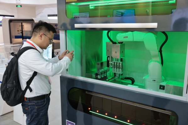 在協同創新示範展示中心,由廣西品格智造研發的機器人分杯處理系統,正在生物安全櫃環境內進行連續作業。