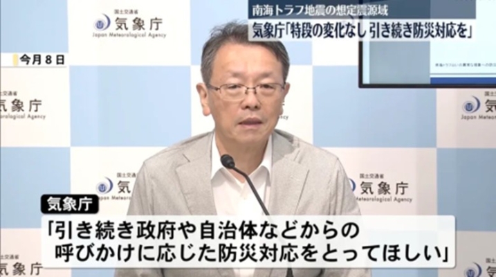 根據日本氣象廳8月11日發佈的有關南海海槽的最新信息顯示,預計震源域沒有發生特別變化、沒有觀測到特別變化的地震活動和地殼活動。