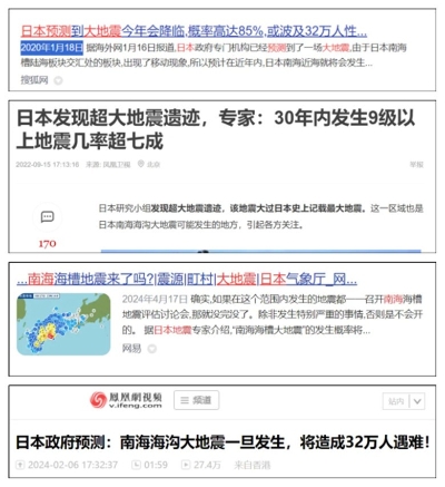 多年間關於日本南海大地震的一些報道截圖,這個話題幾乎每年都會有相關報道。