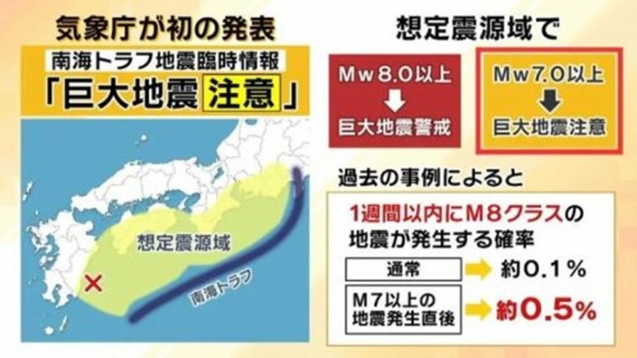 對於日本氣象廳的特大地震預警,有日媒推測,如果發生南海大地震,日本太平洋沿岸包括東京在內的關東地區至九州、沖繩將遭受強震和海嘯。震源地區或將引發高達34米的海嘯。最嚴重的情況,將會造成超32萬人死亡、238萬棟房屋損毀,以及220兆3000億日元的經濟損失。