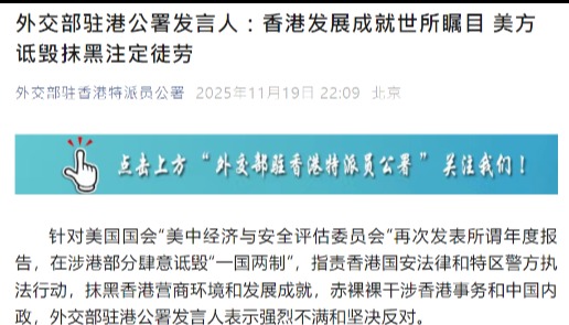 針對美國國會“美中經濟與安全評估委員會”再次發表所謂年度報告,在涉港部分肆意詆毀“一國兩制”,指責香港國安法律和特區警方執法行動,抹黑香港營商環境和發展成就,赤裸裸干涉香港事務和中國內政,外交部駐港公署發言人表示強烈...
