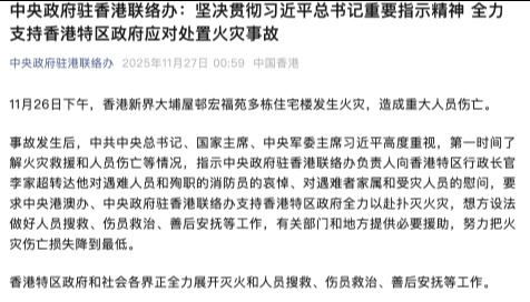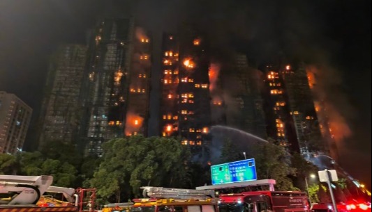 香港大埔一個居民小區26日下午發生五級大火,釀13人死亡多人受傷,1名消防員在火警中殉職。香港中通社記者現場直擊,不斷有消防力量加入救援,入夜後火勢持續,至晚間11時災情仍嚴重。