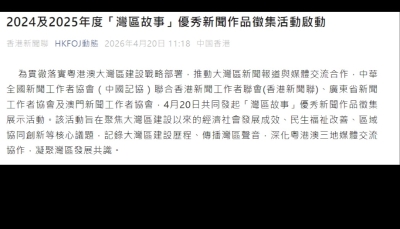 中華全國新聞工作者協會(中國記協)聯合香港新聞工作者聯會(香港新聞聯)、廣東省新聞工作者協會及澳門新聞工作者協會,4月20日共同發起“灣區故事”優秀新聞作品徵集展示活動。該活動旨在聚焦大灣區建設以來的經濟社會發展成效...