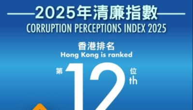 香港清廉指數升至全球第12位