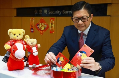香港新聞網2月12日電 農曆新年即將到來,香港保安局辦公室已洋溢濃厚節日氣氛。保安局局長鄧炳強12日在社交平台分享,不經不覺下星期就是農曆新年,他路過保安局接待處時見到同事忙着影相,原來今年除了擺攢盒,還有策馬奔騰...