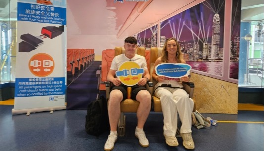 為提醒港澳航線高速船乘客扣上安全帶,香港海事處3日在上環港澳碼頭及尖沙咀中國客運碼頭展開新一輪宣傳活動,提醒港澳航線高速船乘客須扣上安全帶,確保海上旅途安全。其中,上環港澳碼頭設有模擬船艙。