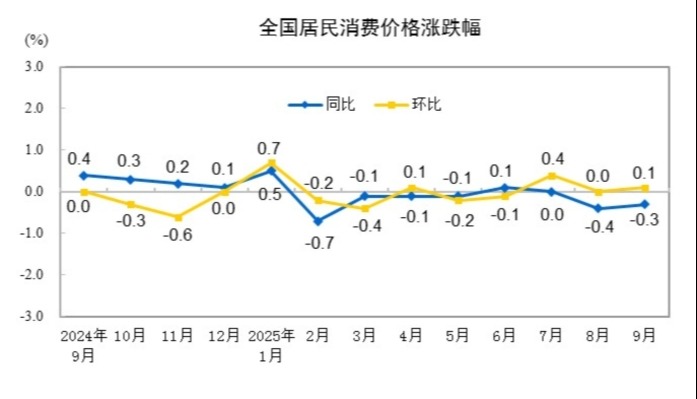 中國9月份CPI同比下降0.3% 環比由平轉漲