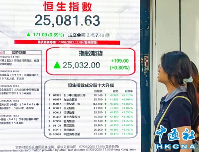 內地7月出入口表現勝預期,A股強勢,港股7日進一步升至25000點關口。恆生指數收市報25081點,升171點。大市成交額為2457億港元。