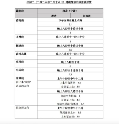港鐵年廿九通宵服務安排(MTR Mobile截圖) 年廿九(16日)、年初一(17日)特別交通安排如下: 港鐵 港島線、荃灣線、觀塘線、將軍澳線(北角至寶琳段及調景嶺至康城段)、南港島線、東涌線、東鐵線(金鐘至上水段)、屯馬線,以及輕鐵線第505、507、610、614P、615P、706及751號會通宵提供服務。 除機場快線及迪士尼線外,港鐵路線將於下午3時起分階段加密班次,並在其他時段因應乘客需求而加強服務。港鐵巴士第506、K51及K54A號線將會延長服務時間。 屯馬線會於年初一晚上加密班次,方便市民觀賞花車巡遊匯演。迪士尼線亦會於年初一至年初七,加密早上時段的列車班次,方便市民及旅客前往主題樂園。 巴士 8條特別巴士路線(城巴第38S;九巴第N43、N64P、N243、N272;及過海巴士第N116、N600及N601號線)會於年初一(17日)凌晨提供特別巴士服務。 渡輪 天星小輪大年初一(17日)上午6:30至晚上11:30免費乘搭。(完) 【編輯:王少喆】