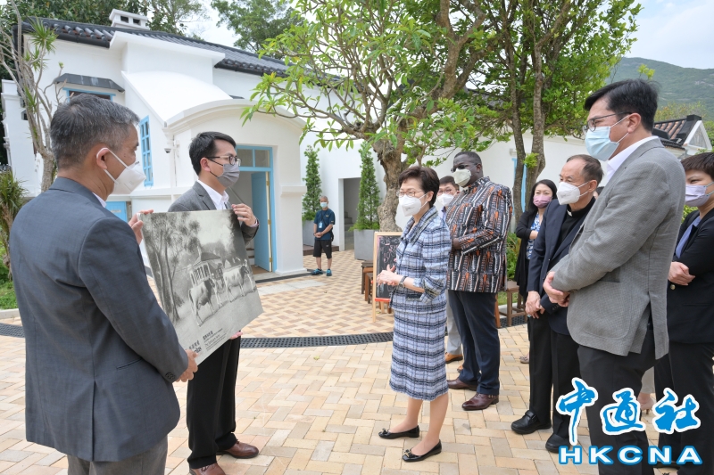 •   4月22日,香港特區行政長官林鄭月娥(右一)到訪薄鳧林牧場,了解薄扶林舊牛奶公司高級職員宿舍在第四期活化歷史建築夥伴計劃下的活化情況。 香港中通社圖片