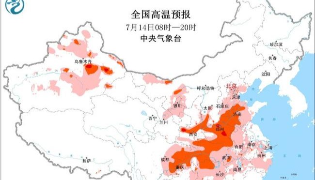 香港新聞網7月14日電 中央氣象台14日06時繼續發佈高溫橙色預警:預計7月14日白天,除西北和西南地區,全國大部分地區最高氣溫均在35℃左右,安徽中南部、江蘇中南部、上海、湖北、湖南中北部、江西、浙江、福建、四川東部、重慶、貴州東北部等地的部分地區最高氣溫37~39℃,江蘇南部、浙江中北部、四川東南部、重慶、陝西南部等地局地可達40℃以上。