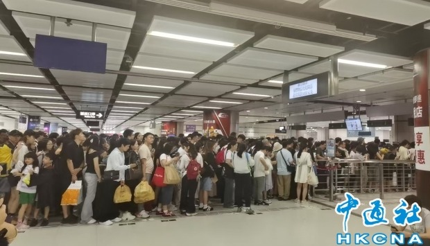 早上八點多,深圳福田口岸已經人潮湧湧。圖片來源:香港新聞網 到了中午時間,有在落馬洲/福田口岸排隊等待通關的市民說:“從來沒見過落馬洲/福田口岸可以滿成這個樣子。”口岸內的廣播不停講“過境大堂十分擠逼!請聽職員指揮!”