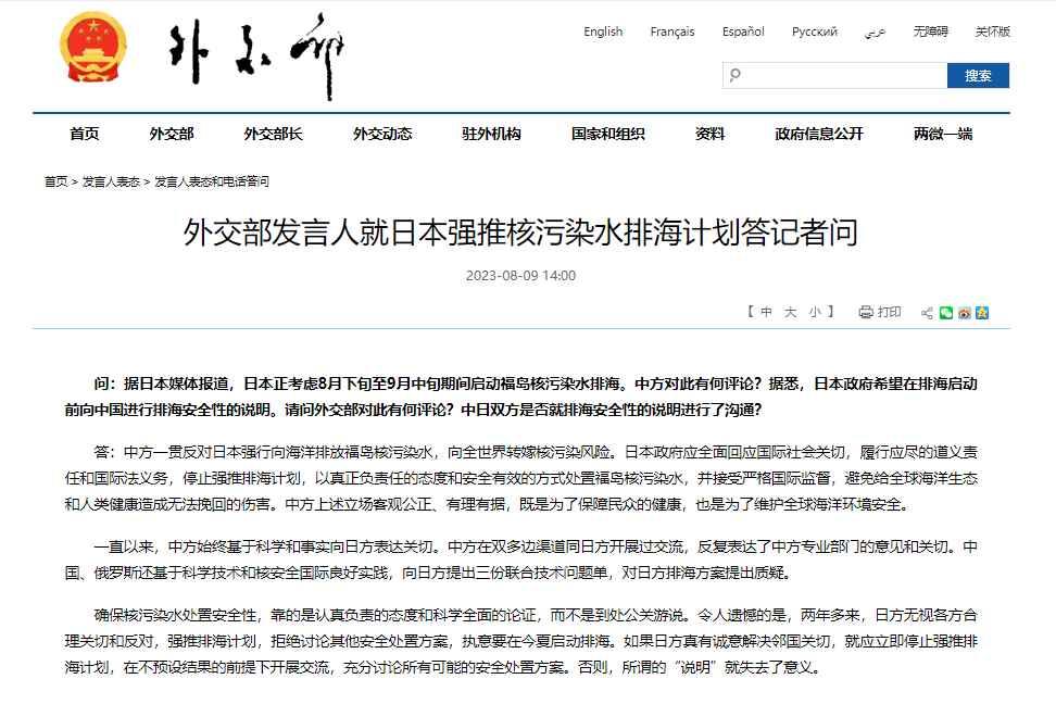 香港新聞網8月9日電 據中國外交部網站9日消息,外交部發言人就日本強推核污染水排海計劃答記者問時指出,中方一貫反對日本強行向海洋排放福島核污染水,向全世界轉嫁核污染風險。日本政府應全面回應國際社會關切,履行應盡的道義責任和國際法義務,停止強推排海計劃,以真正負責任的態度和安全有效的方式處置福島核污染水,並接受嚴格國際監督,避免給全球海洋生態和人類健康造成無法挽回的傷害。