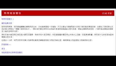 香港新聞網8月31日電 隨著超強颱風“蘇拉”靠近香港,風勢有所增強。香港天文台在今天(8月31日)下午3時40分改發三號強風信號,並會在明天(9月1日)凌晨2時至5時改發八號風球。香港特區政府今天下午宣布,全港幼稚園及中小學明天將停課。