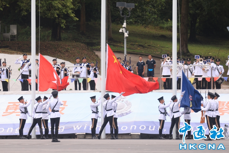 香港警察學院9月16日舉行結業會操,香港中聯辦主任鄭雁雄在典禮中檢閱畢業的見習督察和學警。圖為昇旗儀式。(香港中通社記者 許其皓攝) 香港中通社圖片 不過,鄭雁雄稱也還有外國敵對勢力企圖破壞香港發展穩定,也還有反中亂港分子妄圖捲土重來,而他堅信在特區政府帶領下,香港警隊上下一定會忠誠專業、恪盡職守,始終堅決維護國家安全,全面準確貫徹一國兩制方針,堅決維護特別行政區限制執行,嚴格執行香港國安法和本地法律,全力築牢國家安全的防線,始終堅定保障社會穩定同各類違法犯罪行為堅決有效作鬥爭,切實保護市民生命和財產安全,為維護香港、亞洲最安全城市的聲譽做出應有的貢獻。 鄭雁雄作“檢閱官致辭”後,會操隊伍再前進,並向鄭雁雄致第二次“全體敬禮”,之後會操隊伍離場,結業班步操經過檢閱台向鄭雁雄敬禮。(完) 【編輯:紀東】