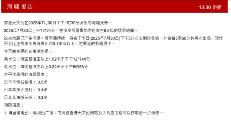 香港新聞網4月3日電 3日上午7時58分,台灣花蓮海域發生7.3級猛烈地震。香港天文台11時10分發出海嘯報告指,該地震預計會產生影響南海的海嘯,預料對香港影響不大。