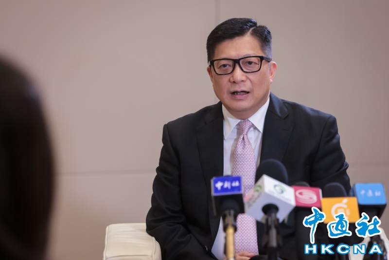 (香港中通社記者 謝光磊 攝) 香港中通社圖片 作為維護國安條例立法工作的主要推動者,鄧炳強指出,立法後初期,與律政司司長做了很多推廣及解說工作,包括到電台、電視台、商會講解。接下來,會將條例講解工作拼接進整體國家安全的推廣工作中。