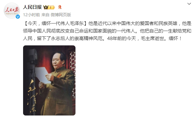 人民日報官方微博截圖 人民日報官方微博當日發文“緬懷一代偉人毛澤東”,並稱他是“近代以來中國偉大的愛國者和民族英雄”、“領導中國人民徹底改變自己命運和國家面貌的一代偉人”;又指他“把自己的一生獻給黨和人民,留下了永志後人的崇高精神風範。” 央視新聞官微發布彩色版開國大典影像緬懷毛澤東,並稱“他的一生是為國家富強、民族振興、人民幸福而不懈奮鬥的一生”。 9月9日適逢星期一,位於北京的毛主席紀念堂按例閉館,但毛主席紀念堂微信公眾號9月5日發布公告,紀念堂9月9日將開放供公眾瞻仰,特別設置了上下午兩個接待時段。 毛主席紀念堂微信公眾號9月9日還開設“鮮花獻偉人”二維碼,讓公眾遠程“跟隨瞻仰隊伍向毛主席敬獻一束鮮花”。 解放軍東部戰區在官微配發了9張毛澤東照片,並發文稱:“一代偉人的豐功偉績和卓越功勳像一座不朽的豐碑讓人懷思久遠。讓我們一起緬懷他的豐功偉績,向他致以崇高的敬意!毛主席永遠活在人民心中!” 近日,歷史學者蔣建農著作的《毛澤東》一書由中共黨史出版社出版。據簡介,該書對毛澤東波瀾壯闊的一生進行了全景式描述,以巨量史料研究為基礎,客觀真實地展示了毛澤東的生平和思想。(完) 【編輯:淩玉輝】