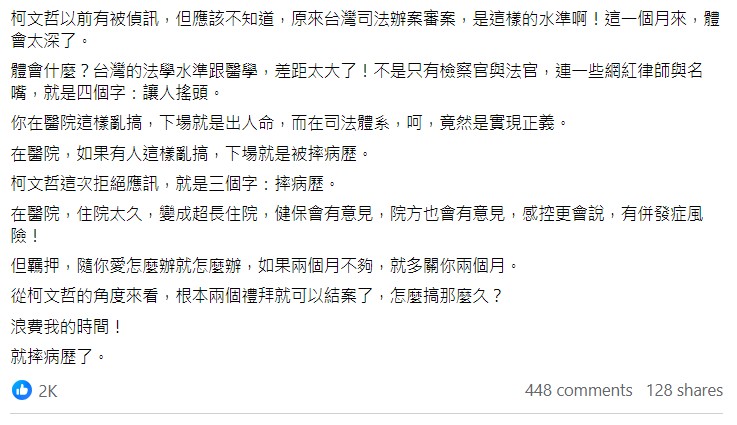 (圖源:沈政男臉書截圖) 沈政男進一步表示,在醫院若出現類似情況,可能導致嚴重後果;而在司法體系中,卻可以被視為實現正義。他強調,若在醫院內部出現亂象,最終的結果會是“摔病歷”,而柯文哲此次拒絕應訊亦可視為“摔病歷”。他指出,住院時間過長會引發健保及院方的關注,而羈押情況卻可以隨意延長,甚至若兩個月不夠,還能多關兩個月。 沈政男最後指出,從柯文哲的角度來看,案件應在兩周內結案,對於案件拖延感到不滿,並強調“就摔病歷了”。(完) 【編輯:黃璇】