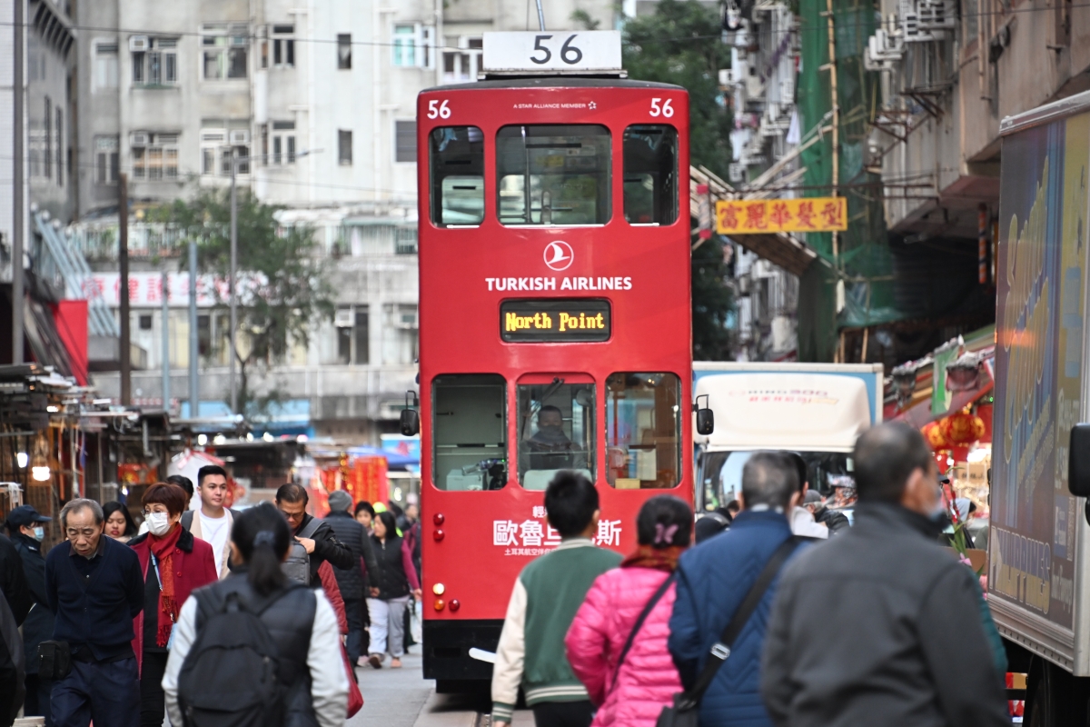 在特色的街市上,古老電車緩慢穿過街道 ,一派新春景象