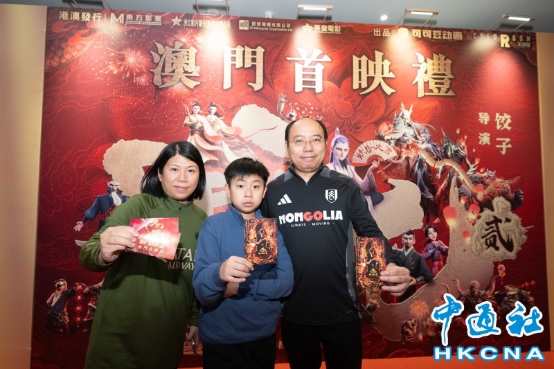 首映禮由東方影業、洲立影片、銀都機構及英皇電影四大公司聯合舉辦,影片於2月22日起在港澳地區全面上映。 香港中通社圖片 她表示,文化局對《哪吒2》在澳門上映表示歡迎,祝願上映活動圓滿成功,並期待未來有更多優秀內地電影與澳門觀眾見面。 首映現場,觀眾反響熱烈。澳門市民鄭女士在進入影廳時還與家人在《哪吒2》海報前自拍“打卡”,她表示,雖然此前在社交媒體上已瀏覽了大量相關短視頻,但走進影院時依然很激動,《哪吒2》不僅畫面精良,故事精彩,更有意義的是將中國神話故事以老少鹹宜的動畫形式創新呈現,讓更多觀眾感受到中華優秀傳統文化的魅力。 在電影結束後,有受訪觀眾大讚“好正!好震撼!真喺好值得睇,成個觀感非常好,環境亦較舒適”,一直對《哪吒2》期待已久,終於等到在港澳上映。亦有觀眾認為《哪吒2》能有助觀影者更好地了解中華文化,希望未來有更多相關的電影上映。 從柿山哪吒古廟到大三巴哪吒廟,在澳門人心中,“哪吒”扎根蓮花寶地,是中華文化傳承的代表之一。澳門觀眾黃光柱說,《哪吒2》結合頂尖的動畫技術和生動的叙事方式,很多畫面看得讓人熱血沸騰。很高興看到電影不斷刷新票房紀錄,作為澳門青年感到非常驕傲和自豪! 澳門觀眾張飛燕說,《哪吒2》故事情節感人至深。雖在內地搶“鮮”看過,但“二刷”時,哪吒重視親情友情、抗爭不公命運的形象,依舊讓她心潮澎湃。