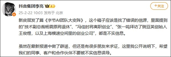 香港新聞網2月22日電 2月22日,抖音集團副總裁李亮在社交平台微博回應稱,《字節AI團隊大變陣》這個稿子應該是找了錯誤的信源,裡面提到的“技術副總裁楊震原將退休”、“馮佳時將離職創業”、“張一鳴拜訪了豌豆莢創始人王俊煜,以及上海模速空間裡的創業公司”,都是不實信息。