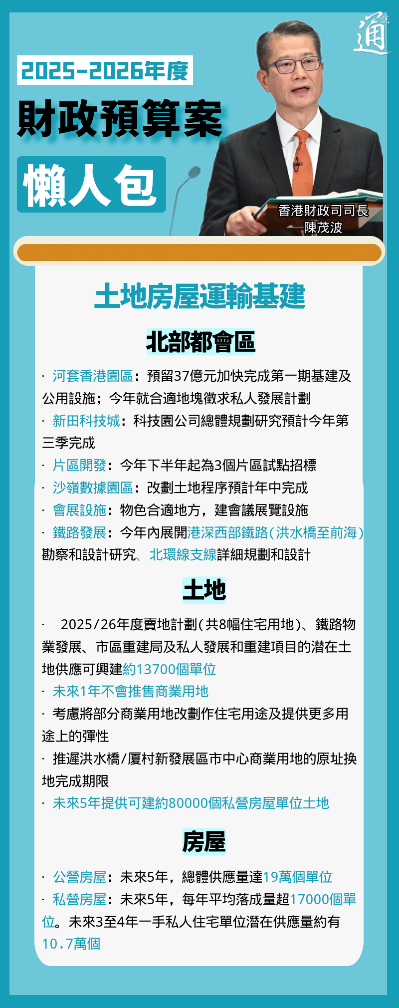 香港新聞網2月26日電 香港特區政府財政司司長陳茂波今日(26日)發表2025至2026年度財政預算案,預測香港經濟2025年繼續溫和增長,全年實質增長介乎2%至3%。 新一份財政預算案提出一系列實際和有效的措施,包括預留10億元(港幣,下同)成立香港人工智能研發院,加速培育新質生產力,全力發展人工智能為關鍵產業,並賦能傳統產業升級轉型;繼續優先為北部都會區項目投入資源,重點產業包括創科、高端專業服務和現代物流、專上教育等。 本次預算案還提出“強化版”的財政整合計劃,包括至2027至2028年度累計削減政府經常開支7%。陳茂波表示,該計劃提供了清晰的目標,可以逐步在本屆政府任期內把經營帳目回復平衡。 一組圖,了解財政預算案重點內容↓↓