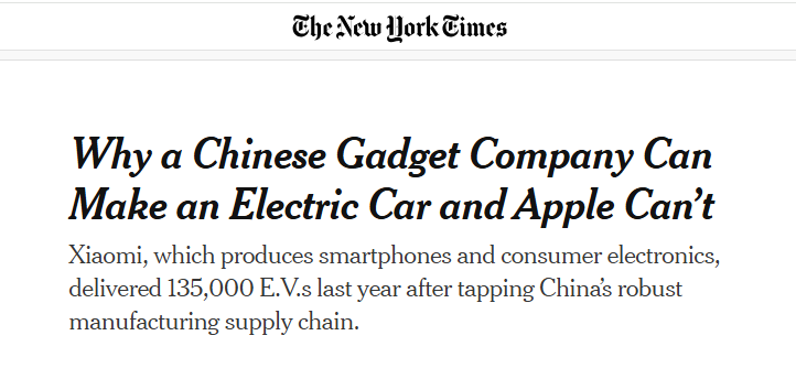 《紐約時報》報道截圖 除了小米,《紐約時報》還注意到其他幾家中國電動汽車公司,例如零跑汽車、理想汽車和賽力斯集團也在這個行業取得成功。 《紐約時報》認為,中國電動汽車企業得益於中國政府大量的政策支持,從而實現了對供應鏈細到電池礦物資源的全面掌控。這種先發優勢使得兩家中國企業比亞迪和寧德時代發展成為全球最大的電動汽車電池製造商。 小米也正是充分利用了這條供應鏈,其車型搭載了來自比亞迪和寧德時代的電池,通過接手北汽集團旗下一家工廠,該公司得以快速啟動生產。目前,北京的建築工人正夜以繼日地建設第二家小米工廠。 咨詢公司艾睿鉑的亞洲汽車業務主管戴加輝(Stephen W. Dyer)說,所有這些製造能力令中國電動汽車公司可以用遠少於中國傳統汽車製造商的時間,完成從開發到生產的工作,使它們能够迅速將新車型推向市場,并專注於開發可以不斷更新的軟件。 中國電動汽車產業的全球影響力在不斷提升。根據國際能源署(IEA)數據,2023年中國電動汽車出口量已佔全球的30%以上,顯示出其在國際市場中的競爭力和影響力。根據中國汽車工業協會今年1月發佈的數據,2024年中國新能源汽車出口128.4萬輛,較上年增長6.7%,繼續領跑全球。 《紐約時報》稱,激烈的競爭促使許多中國汽車製造商向全球汽車市場投放價格低廉的電動汽車。去年,比亞迪在全球銷售了400多萬輛新車。 難怪中國乘用車協會秘書長崔東樹說,小米汽車在中國以外的道路上行駛只是時間問題。(完) 【編輯:丘志彬】