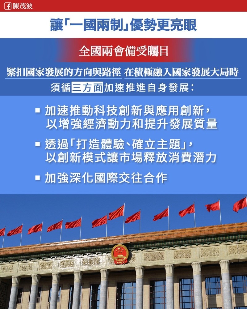 陳茂波網誌圖片 在創科上,陳茂波表示,要加速推動科技創新與應用創新,以增強經濟動力和提升發展質量。他指出香港要堅持推動傳統產業改造升級和開闢戰略性新興產業、未來產業新賽道並重,同時也要“因地制宜”,更好發揮香港國際金融中心的功能,加強推動科技與資本的結合。 他提到,香港的金融市場為科技創新與產業創新提供了重要支撐。與此同時,科技與產業創新也為港股增添新的動力。他舉例,在科技股強勢帶動下,香港股市上月每日平均成交額接近3000億港元水平。 在消費及深化國際交往合作上,陳茂波分別表示香港要通過“打造體驗、確立主題”,以創新模式讓市場釋放消費潛力;在深化國際交往合作上,香港要在“一國兩制”下用好“內聯外通”的獨特優勢。 陳茂波指出,科技驅動創新、體驗帶動消費、交流促進合作。香港要將全國兩會精神的重點,融匯到社會經濟發展的工作當中,推動香港經濟高質量發展、讓經濟成果更好惠及市民,同時為中國式現代化強國建設、民族復興偉業,貢獻更大的香港力量。(完) 【編輯:李冉】