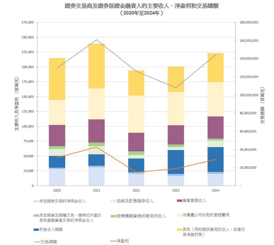 香港新聞網3月27日電 香港資本市場在2024年全球經濟波動加劇的背景下,展現出非凡韌性與活力,多項核心財務指標創下歷史新高。據香港證監會昨(26日)發佈消息,香港證券業的財務表現於2024年淨盈利總額按年增長56%至444億港元,進一步鞏固其作為國際金融中心的戰略地位。 據香港證監會網站消息,香港所有證券交易商及證券保證金融資人於2024年的淨盈利總額為444億元,較2023年增加 56%。總收入較前一年增加11%至2,226億元,增幅較開支的4%輕微昇幅為大。 與2023年相比,交易總額由107.9萬億元增加34%至144.1萬億元。