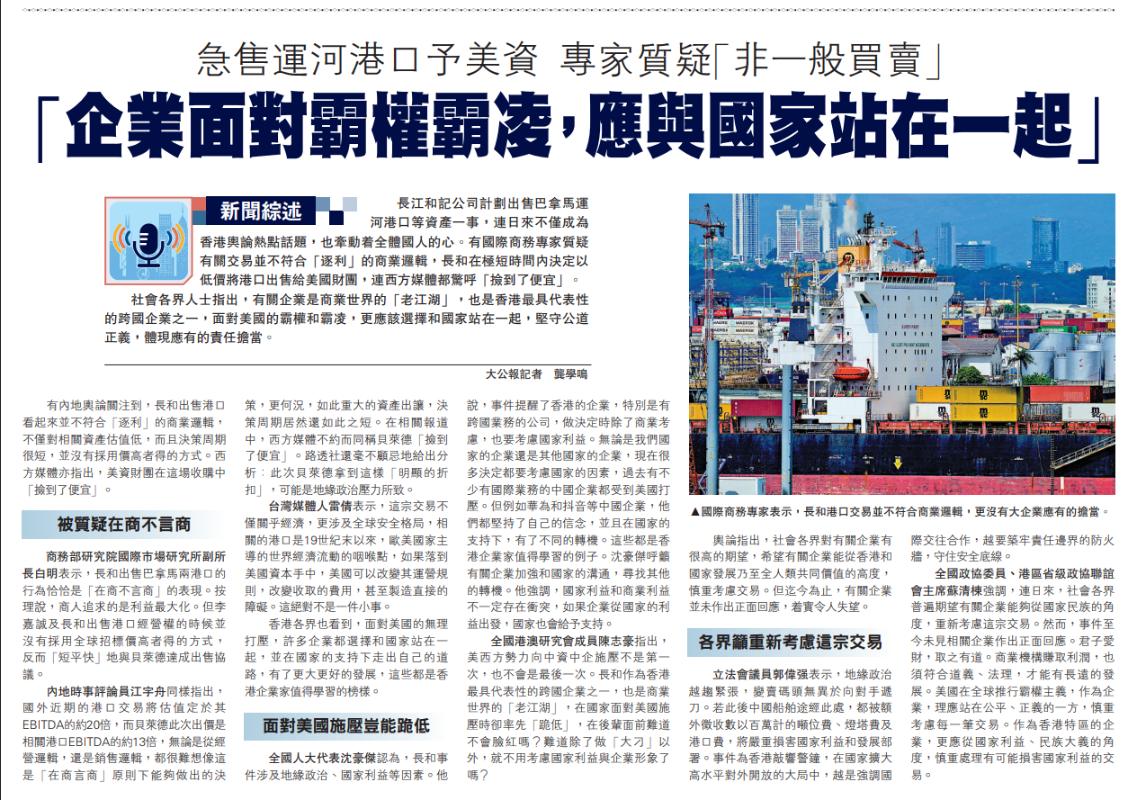 評論文章《停止“公關”操弄,做出正確抉擇》指出,大量媒體引用美國彭博社的一條消息,聲稱長和出售港口的交易將“按原計劃”進行,並會在4月2日前簽訂協議。彭博社獲如此“獨家新聞”,網絡媒體積極“和應”解讀,這正是有關企業“外媒+網媒+水軍”的公關手段。 文章揭露,早在今年2月,外媒就放風“長和或失港口經營權”,營造有關企業“被迫出售”的形象;而交易消息公布後,《金融時報》“獨家”報道稱主要買家不是美國人,而是李家的“世交”意大利人;昨日彭博社又“獨家”報道簽約的具體日期,等等。如果不是有人刻意“放風”,這些外媒如何能得到這些“獨家”? 該評論文章認為,事件發生以來,在社交平台上出現各種所謂的“分析”,以及轉發外媒的“二次創作”,誤導社會認知,打“民意牌”欺騙公眾。這些抹黑戰術,居心何在,已不言而喻。這一系列的操作,顯示了有關企業的所謂公關實力,但也暴露了心虛氣短、企圖掩蓋真相的目的,更加說明了該交易絕非所謂的“純商業考慮”。 大公報當天刊出的報道,引述商務部研究院國際市場研究所副所長白明表示,長和出售巴拿馬兩港口的行為恰恰是“在商不言商”的表現。按理說,商人追求的是利益最大化。但李嘉誠及長和出售港口經營權的時候並沒有採用全球招標價高者得的方式,反而“短平快”地與貝萊德達成出售協議。 內地時事評論員江宇舟指出,國外近期的港口交易將估值定於其EBITDA的約20倍,而貝萊德此次出價是相關港口EBITDA的約13倍,無論是從經營邏輯,還是銷售邏輯,都很難想像這是“在商言商”原則下能夠做出的決策,更何況,如此重大的資產出讓,決策周期居然還如此之短。 台灣媒體人雷倩表示,這宗交易不僅關乎經濟,更涉及全球安全格局,相關的港口是19世紀末以來,歐美國家主導的世界經濟流動的咽喉點,如果落到美國資本手中,美國可以改變其運營規則,改變收取的費用,甚至製造直接的障礙。這絕對不是一件小事。(完) 【編輯:陳卓儀】
