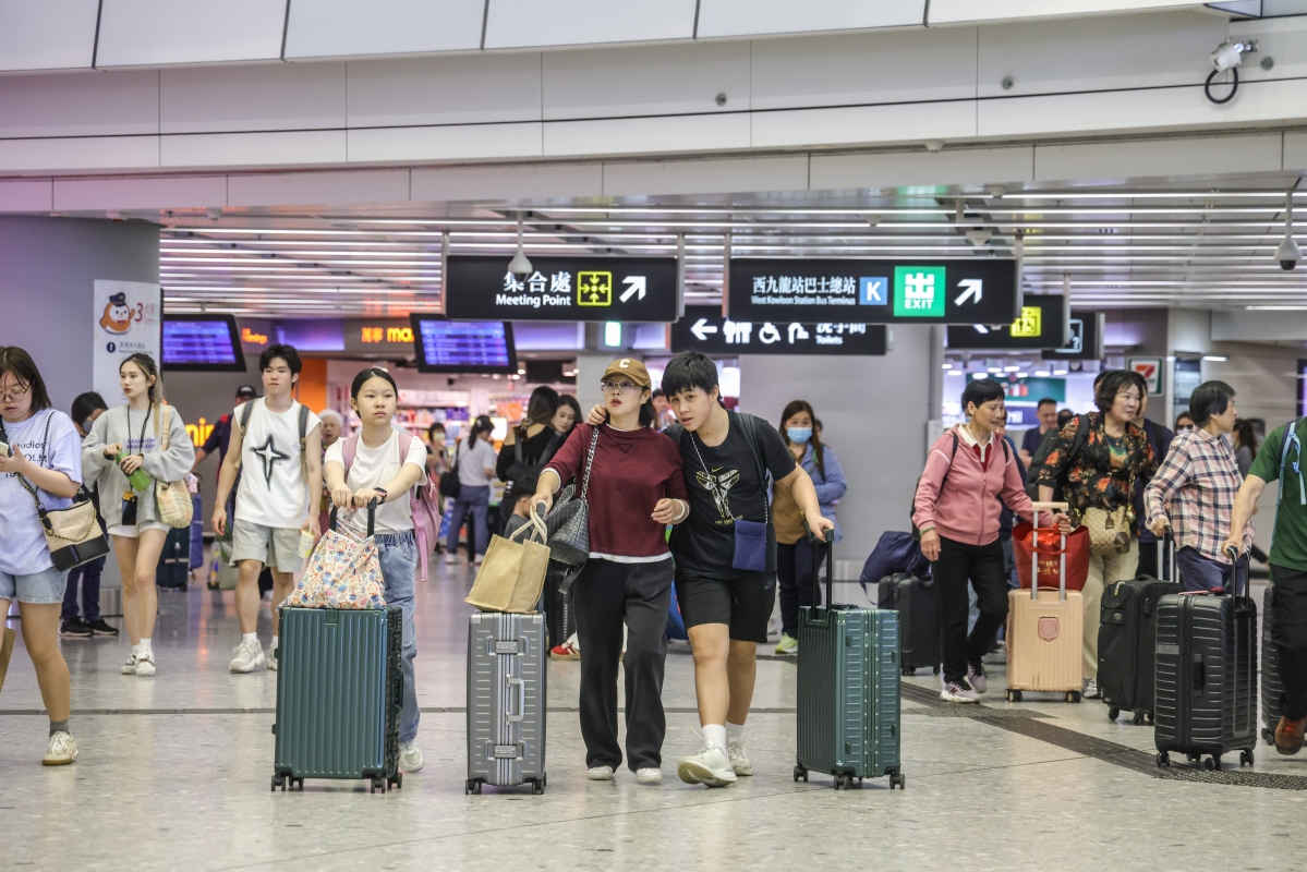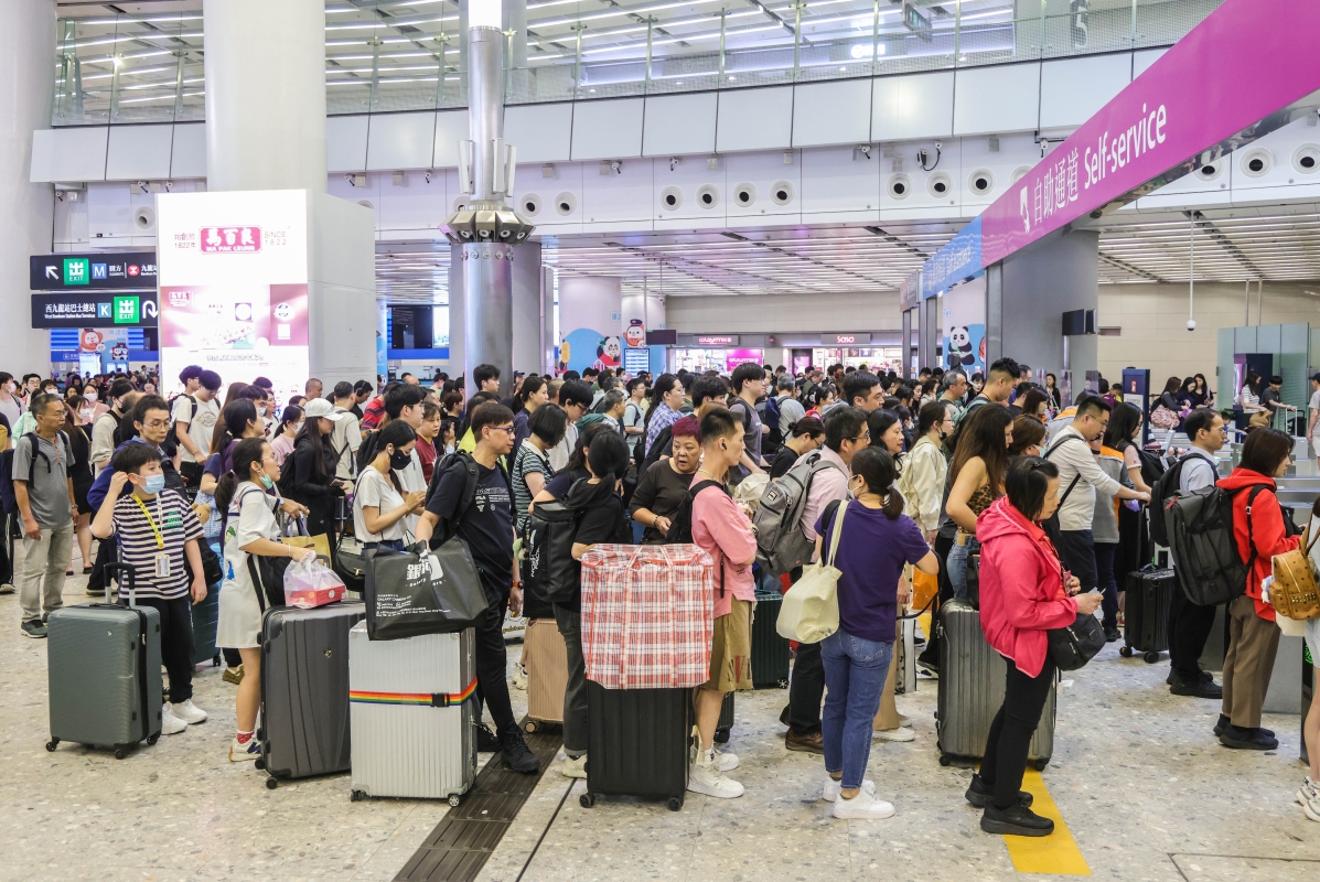 香港西九龍高鐵站大批市民陸續出行 【編輯:洪少葵】
