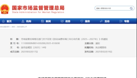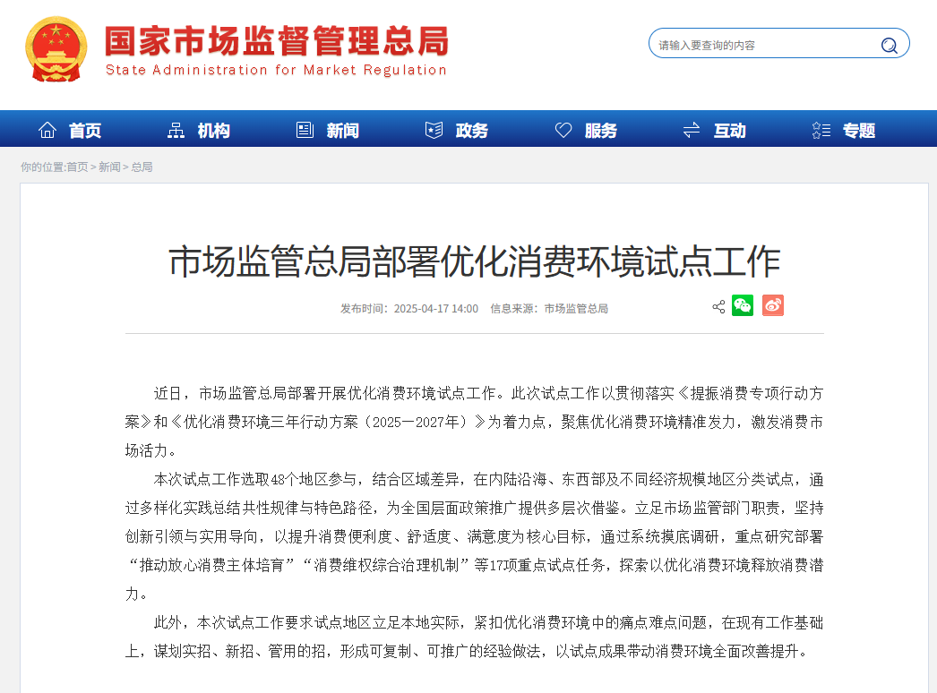 圖源:中國市場監管總局官網截圖 據介紹,本次試點工作立足市場監管部門職責,堅持創新引領與實用導向,以提升消費便利度、舒適度、滿意度為核心目標,通過系統摸底調研,重點研究部署“推動放心消費主體培育”“消費維權綜合治理機制”等17項重點試點任務,探索以優化消費環境釋放消費潛力。 此外,本次試點工作要求試點地區立足本地實際,緊扣優化消費環境中的痛點難點問題,在現有工作基礎上,謀劃實招、新招、管用的招,形成可複製、可推廣的經驗做法,以試點成果帶動消費環境全面改善提升。 今年2月,中國國家市場監管總局等五部門關於印發《優化消費環境三年行動方案(2025-2027年)》。3月全國兩會期間發布的2025年政府工作報告中將“大力提振消費”作為重點工作。3月16日以來,中國國家層面和多個省份陸續發布了提振消費的行動方案。(完) 【編輯:彭玉婷】
