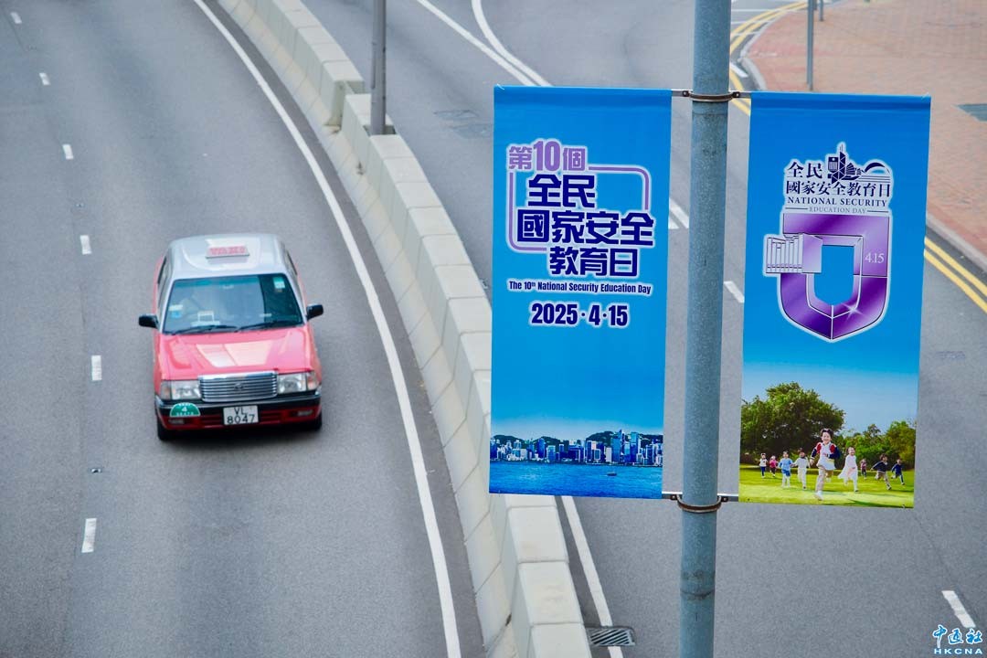 2025年4月15日是第十個“全民國家安全教育日”,亦是全國人民代表大會常務委員會公佈實施香港國安法五周年和《維護國家安全條例》立法生效一周年,香港將在當日舉辦“全民國家安全教育日”相關活動。圖為4月14日香港街頭“全民國家安全教育日”宣傳廣告。(香港中通社記者 許其皓攝)