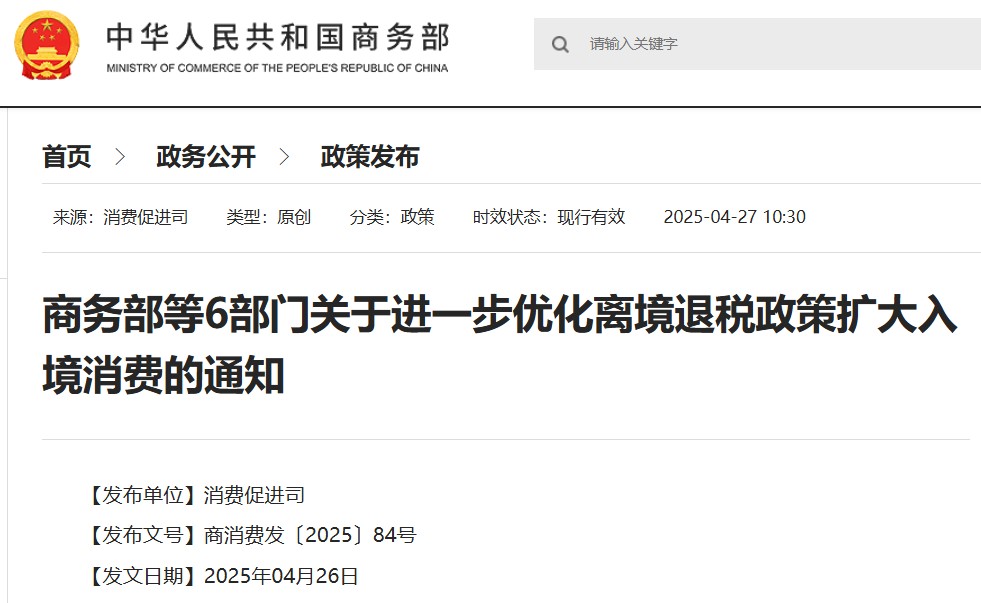 香港新聞網4月27日電 今日下午3时,国务院新闻办公室将举行新闻发布会,请商务部副部长盛秋平和财政部、文化和旅游部、海关总署、税务总局、中国民航局有关负责人介绍优化离境退税政策扩大入境消费有关情况,并答记者问。 据商務部網站昨(26日)发布消息,商务部等6部門發佈關於進一步優化離境退稅政策擴大入境消費的通知(簡稱“通知”)。商务发布的通知提出,優化離境布局。鼓勵各地區在大型商圈、步行街、旅遊景區、度假區、文博場所、機場、客運港口、酒店等增設,擴大覆蓋面。積極引導國際名品、國貨潮品、老字號店鋪、文創店、紀念品店、禮品店、特產店等成為退稅商店。支持具備條件的地區打造一批離境退稅特色街區。同時,放寬離境退稅商店備案條件。將離境退稅商店備案條件在現行的納稅信用級別A級和B級基礎上增加M級,允許新開商店在符合其他相關規定的前提下成為退稅商店。