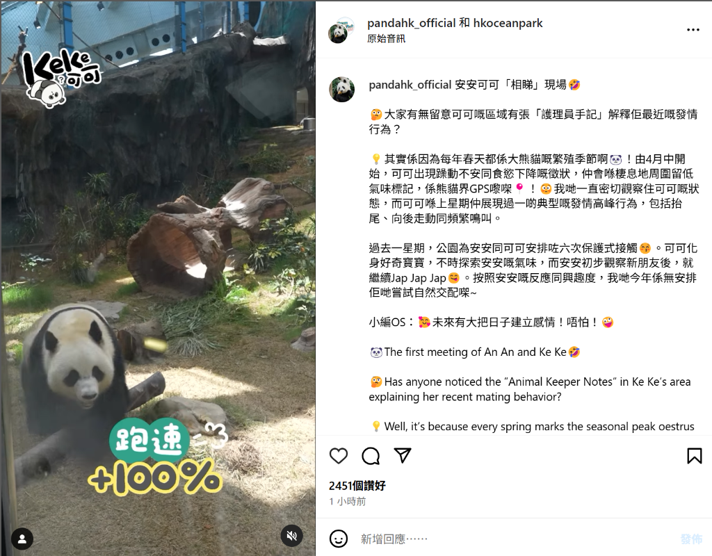 海洋公園社交平台截圖 園方表示,可可在上星期展現過一些典型嘅發情高峰行為,包括抬尾、向後走動同頻繁鳴叫。從園方發佈時視頻可見,可可的跑步速度明顯加快,並非常活潑地跑動。據了解,春天是大熊貓的繁殖季節,因此出現躁動不安和食慾下降的徵狀為正常現象。 由於安安和可可在港時間尚短,園方計劃未來一至兩個繁殖季節繼續通過類似的見面方式,讓牠們適應對方及逐步增進對彼此的興趣。同時護理員將密切觀察和評估牠們在接下來繁殖季節的行為,以決定下一步安排。 (完) 【編輯:梁嘉軒】