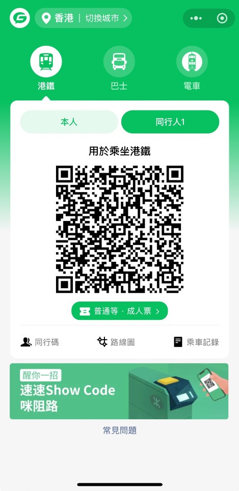 一部手機支援最多三人掃碼 乘搭港鐵出行更具彈性 即日起,在 WeChat/微信“搭車碼”小程序頁面內開通“同行碼”後,即可自動生成最多兩名同行者的港鐵同行碼,掃碼在閘機出入,讓一家大小出行更加暢行無阻。訪港旅客亦可透過這個全新功能為同行而未能使用電子支付的小童或長者掃碼乘車,車費從主用戶 (主碼) 的錢包中扣除,共享升級旅遊體驗。 靈活管理“同行碼” 輕鬆切換票種並可分別查看乘車紀錄 主用戶可透過“管理同行碼”功能,按需要靈活選擇關閉及啟用“同行碼”。主用戶可為同行者選擇乘車票種,包括適用於12歲至64歲人士的成人票,以及適用於3歲至11歲小童及65歲或以上長者的特惠票。同行者的車廂等級 (即普通等/頭等)將預設與主用戶一致。另外,主用戶可在“乘車紀錄”頁面查閱主用戶及同行者的乘車紀錄,有效管理交通支出。 適用於港九新界96個重鐵站 “搭車碼”現已覆蓋港鐵重鐵網絡96個車站(機場快綫車站除外),用戶可透過“同行碼”功能與親友無縫穿梭港島、九龍及新界,進一步享受電子支付的便利。 如何開通WeChat Pay HK“搭車碼”內的“同行碼”功能? 1、先開啟WeChat Pay HK“搭車碼”頁面,點擊左下角的“同行碼”